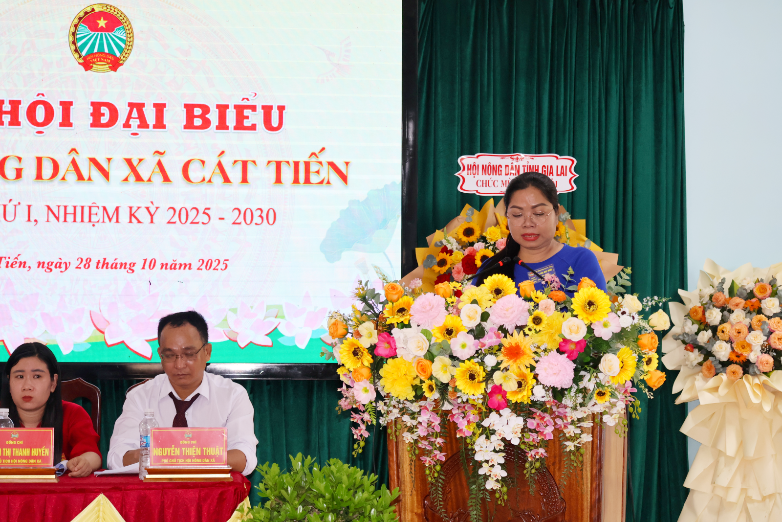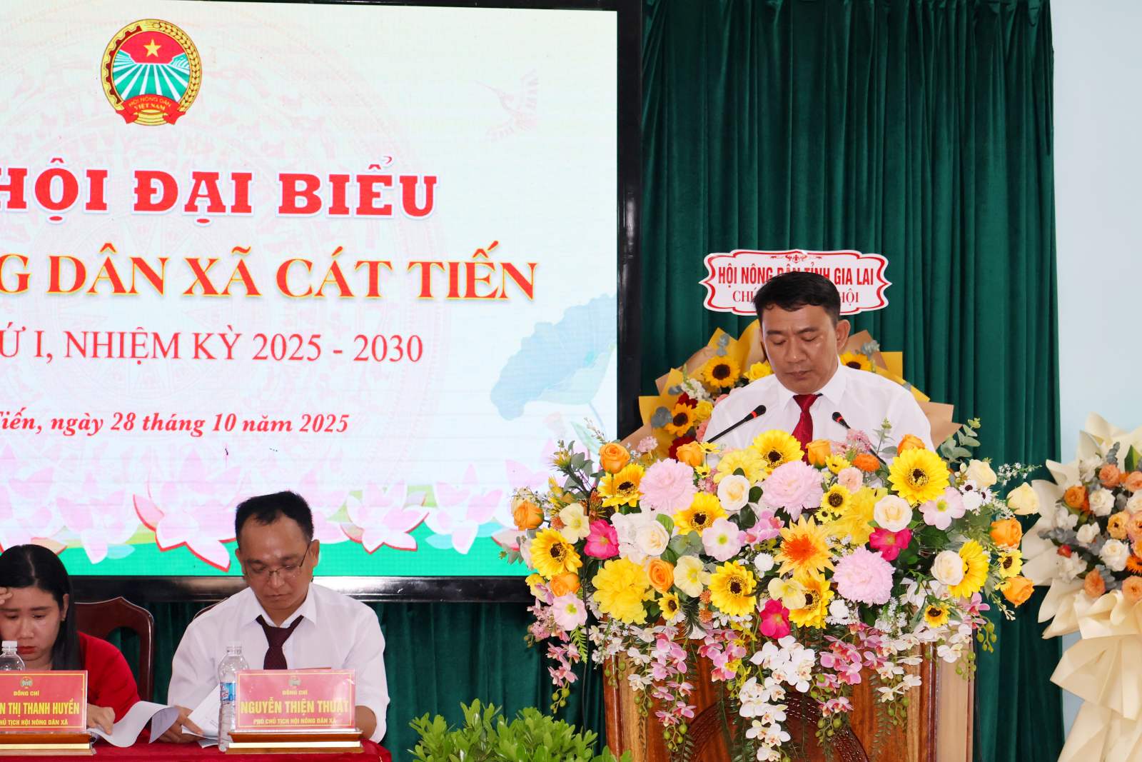 Phát biểu chỉ đạo Đại hội, đồng chí Rơ Chăm H’Hồng - Tỉnh ủy viên, Phó Chủ tịch Ủy ban Mặt trận Tổ quốc Việt Nam tỉnh Gia Lai, Chủ tịch Hội Nông dân tỉnh Gia Lai và đồng chí Nguyễn Hữu nam - Phó Bí thư Thường trực Đảng ủy xã Cát tiến: ghi nhận và đánh giá cao những kết quả đạt được của hội trong nhiệm kỳ qua; đồng thời nhấn mạnh Hội cần thực hiện một số nhiệm vụ: Tập trung xây dựng củng cố tổ chức Hội vững mạnh; đổi mới mạnh mẽ nội dung, phương thức hoạt động, hướng về cơ sở. Tập trung xây dựng và duy trì các mô hình lao động sản xuất hiệu quả, đặc biệt là các mô hình kinh tế tập thể và sản phẩm OCOP. Hỗ trợ hội viên trong cung cấp kịp thời thông tin thị trường, hỗ trợ lao động sản xuất; đẩy mạnh ứng dụng khoa học kỹ thuật trong sản xuất, kinh doanh. Phát huy nội lực khai thác hiệu quả các lợi thế, nguồn lực, tiềm năng và thế mạnh của địa phương…